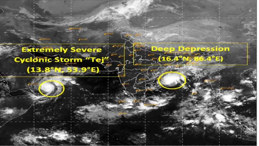 चक्रवात तेज डिप्रेशन डब्ल्यूसी बीओबी पर गहरे डिप्रेशन में बदल गया है जो 22 अक्टूबर को शाम 17.30 बजे आईएसटी पर केंद्रित था, जो पारादीप (ओडिशा) से लगभग 450 किमी दक्षिण में, दीघा से 560 किमी दक्षिण-दक्षिण में और खेपुपारा (बांग्लादेश) से 750 किमी दक्षिण पश्चिम में था। तूफान अगले 24 घंटों के दौरान लगभग उत्तर पश्चिम की ओर बढ़ा और फिर इसने तेज रफ्तार पकड़ ली है। तूफान “तेज” 22 अक्टूबर को 17.30 बजे (आईएसटी) एसडब्ल्यू अरब सागर में सोकोट्रा (यमन) से लगभग 90 किमी उत्तर-उत्तर पूर्व, सलालाह (ओमान) से 410 किमी दक्षिण और अल ग़ैदा (यमन) से 390 किमी दक्षिण पूर्व में केंद्रित था। भीषण चक्रवात के रूप में यह कल यानी 24 अक्टूबर के आसपास उत्तर-पश्चिम की ओर बढ़ेगा और इसके फिर अल ग़ैदा (यमन) के करीब यमन तट को पार करने की बहुत संभावना है