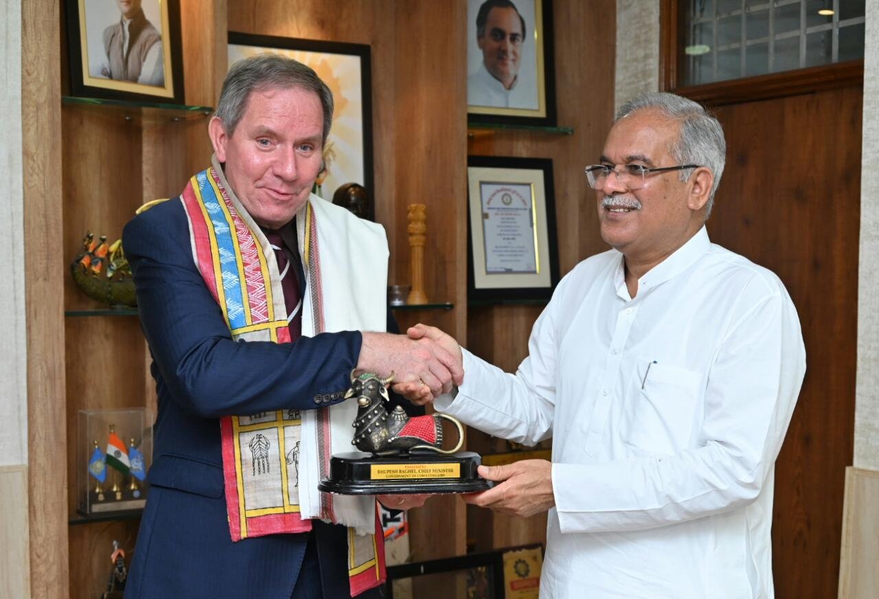 मुख्यमंत्री श्री भूपेश बघेल से आज यहां उनके निवास कार्यालय में कोलकाता में स्थित ब्रिटिश उच्चायोग के डिप्टी हाई कमिश्नर श्री निकोलस लो ने सौजन्य मुलाकात की। मुख्यमंत्री श्री बघेल ने इस दौरान श्री निकोलस को राजकीय गमछा, शॉल और राजकीय पशु ’वनभैंसा’ का बेलमेटल से निर्मित प्रतीक चिन्ह भेंट किया। इस अवसर पर मुख्यमंत्री के सलाहकार श्री विनोद वर्मा और अपर मुख्य सचिव श्री सुब्रत साहू भी उपस्थित थे।
