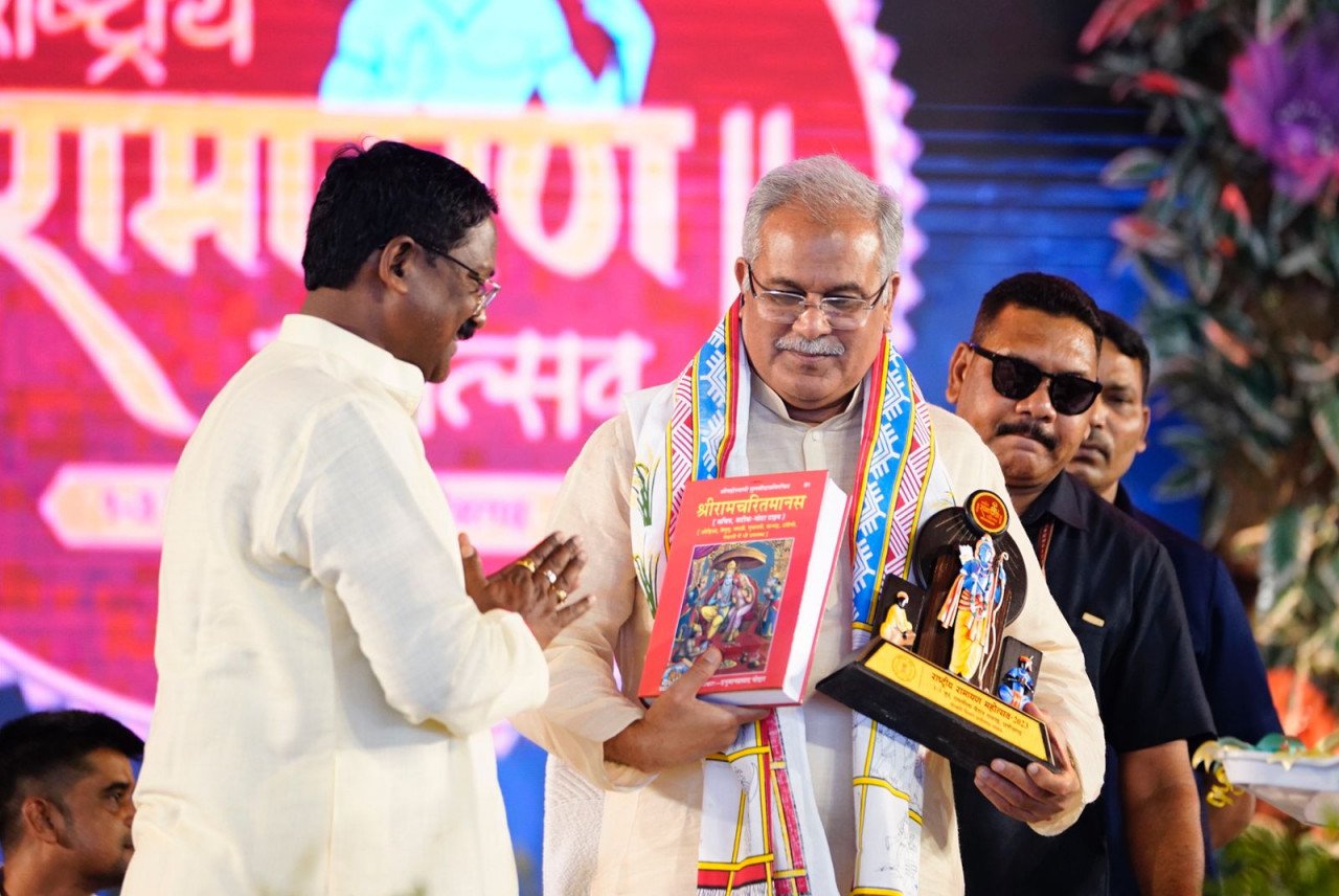 मुख्यमंत्री श्री बघेल का महोत्सव के शुभारंभ अवसर पर रामचरित मानस की प्रति भेंट-कर एवं राजकीय गमछे के साथ किया गया स्वागत।