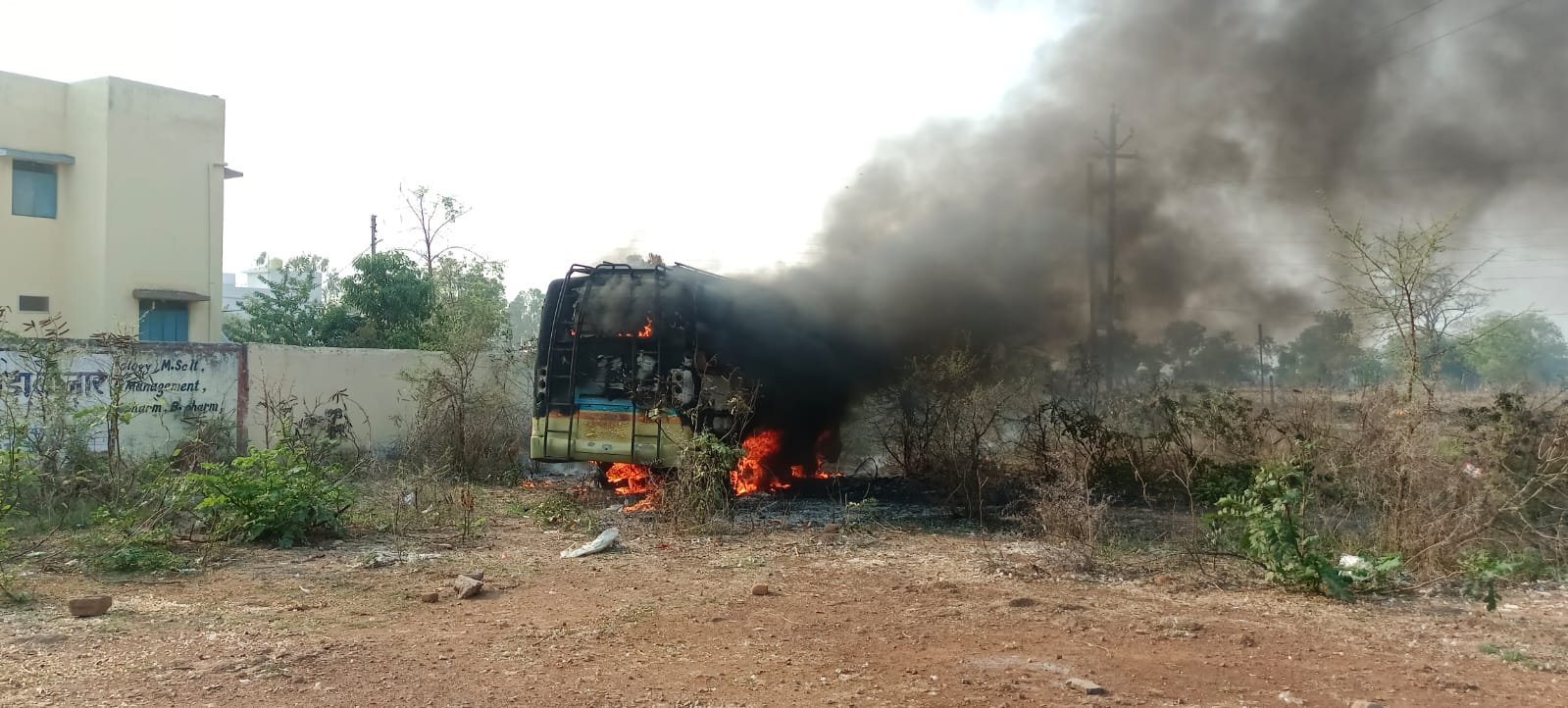 BREAKING NEWS राजिम :- बस में लगी भीषण आग पर पाया गया काबू,