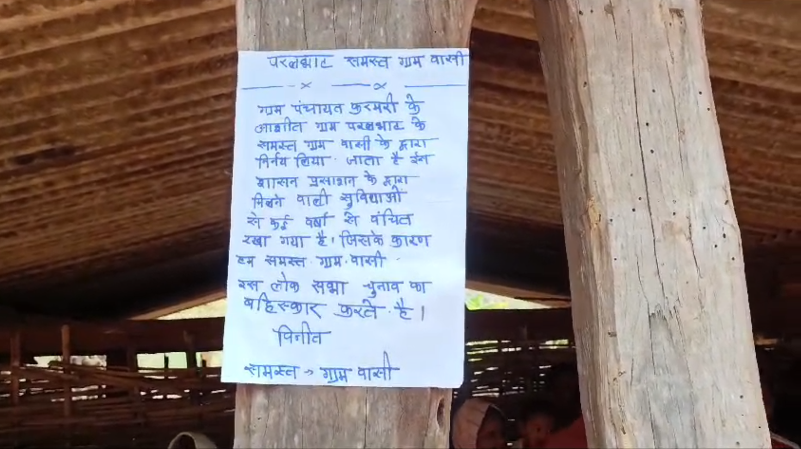 बता दें कि यह मामला नारायणपुर जिले के ग्राम पंचायत करमरी के आश्रित ग्राम परलभांट का है। ग्रामीण लंबे समय से बिजली, पानी और आँगनबाड़ी की समस्या को लेकर कार्यालय के चक्कर काट रहे है। इसके बाद जब अधिकारियों ने ग्रामीणों की समस्या का समाधान नहीं किया तो उन्होंने मतदान के दिन ही चुनाव बहिष्कार का ऐलान कर दिया।